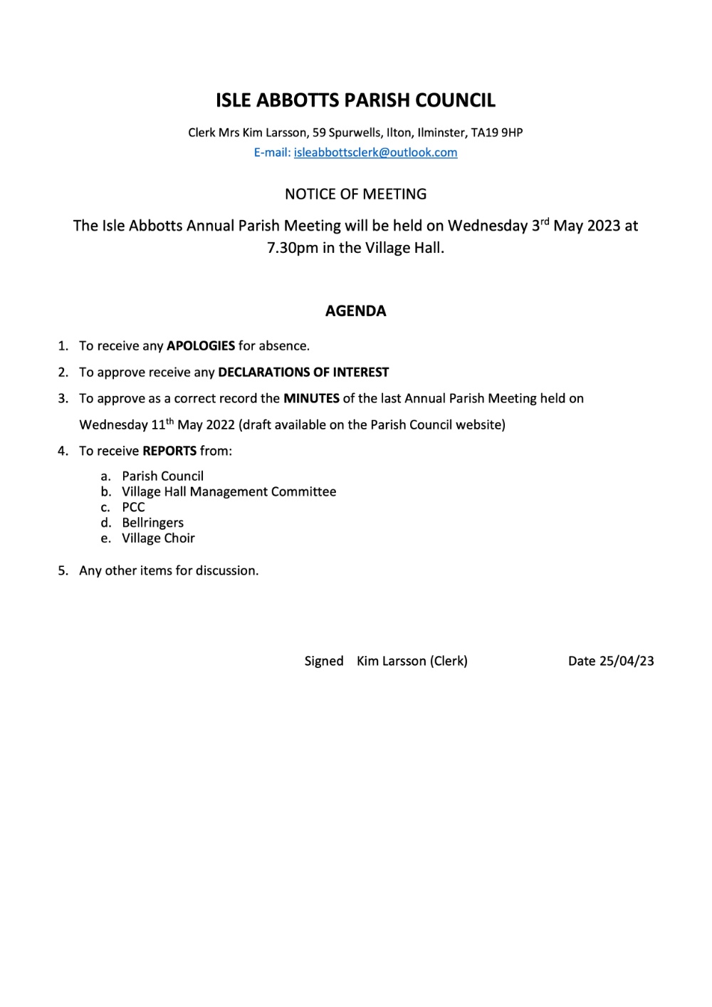 Isle Abbotts Annual Parish Meeting will be held on Wednesday 3rd May 2023 at 7.30pm in the Village Hall.